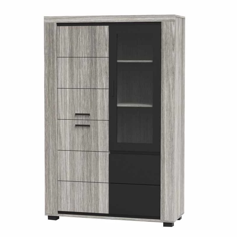 – Vitrinekast met drie deuren en één lade.