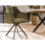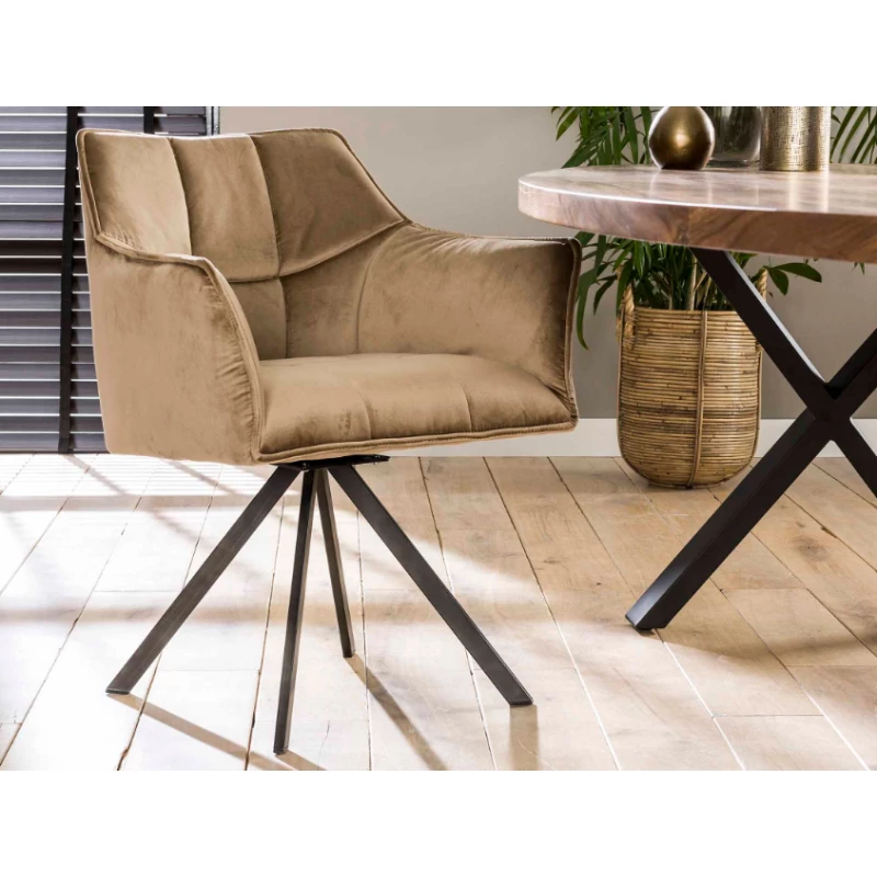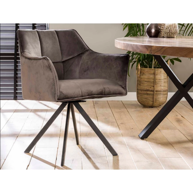 Deze eigentijdse armstoel is uitgevoerd in velvet. Velvet is een glanzende en fijne stof die bekend staat om haar flexibiliteit en sterkte.