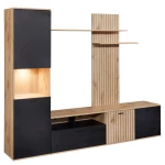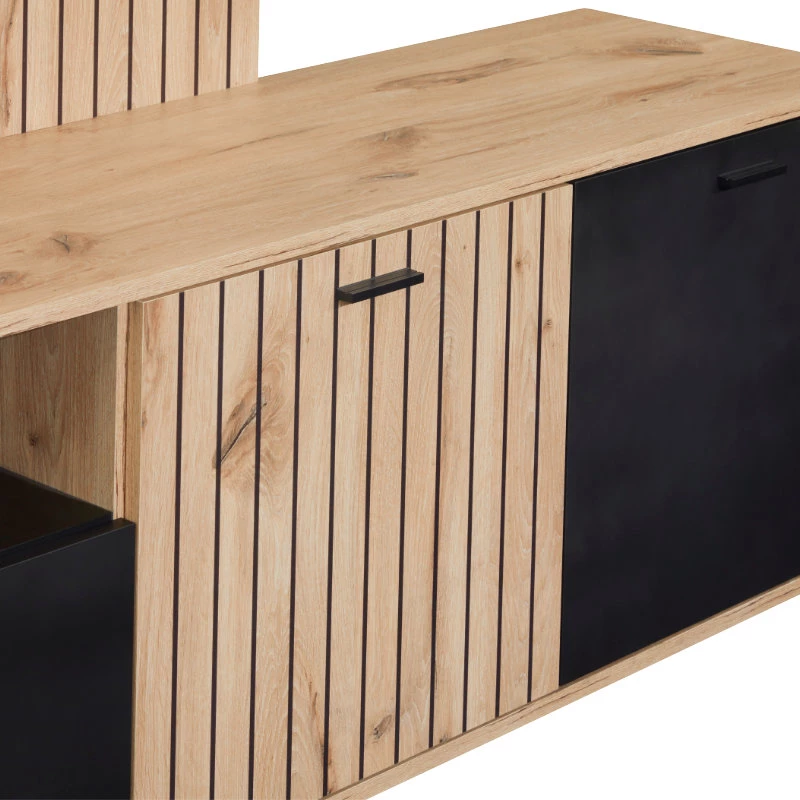 TV wand Silvio heeft een eigentijdse stijl dankzij het latdecor en de antracietkleurige details.
