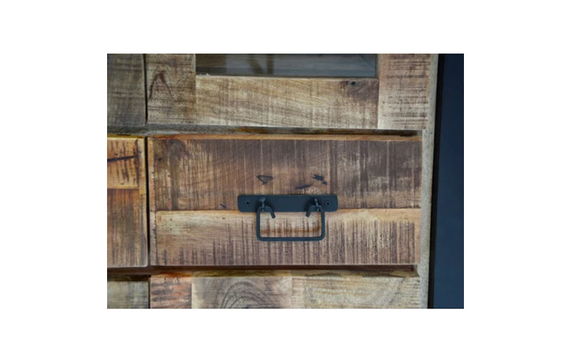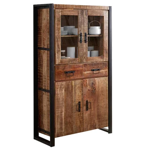 Robuuste vitrinekast vervaardigd uit duurzaam mangohout en afgewerkt met een zwart metalen frame.