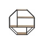 Dit achthoekige wandrek heeft 3 asymmetrische houten planken.